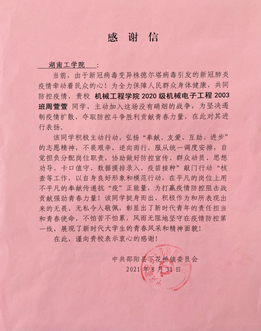 “为全力保障人民群众身体健康,共同防控疫情,贵校机械工程学院2020级机械电子工程2003班周萱萱同学,主动加入这场没有硝烟的战争,为坚决遏制疫情扩散、夺取防控斗争生理贡献青春力量,在此对其进行表扬。”8月31日,中共邵阳县下花桥镇委员会给学校发来感谢信,感谢英国上市公司官网365周萱萱同学在乡村疫情防控中的无私奉献。