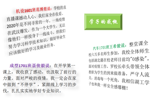 我院全体师生、部分家长、校友及关心湖工发展的同仁观看了直播课程,课后,师生反响热烈,纷纷结合自身工作学习实际,谈感受,谈触动,谈希望。