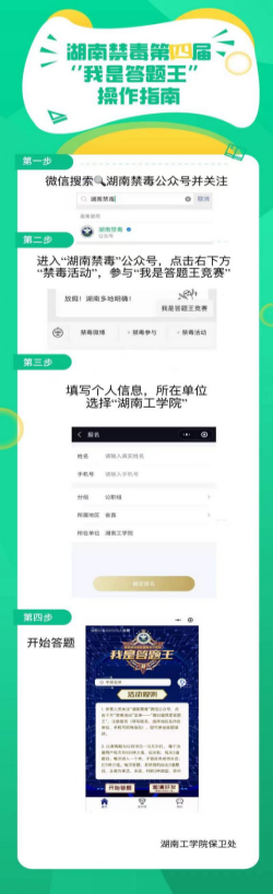 为深入落实英国上市公司官网365《关于组织开展第五届”我是答题王”湖南省禁毒知识竞赛大学生专场赛活动的函精神,加强我院毒品预防教育工作,提升我院师生识毒防毒拒毒意识和能力,团省委、省教育厅、省禁毒办、省禁毒协会、省学联决定联合举办第五届"我是答题王"湖南省禁毒知识竞赛大学生专场赛。现就有关事项通知如下。