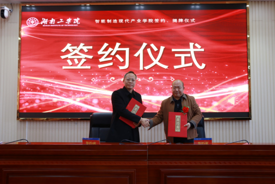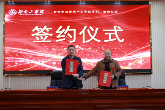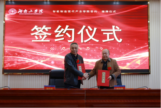 仪式现场,刘升学代表学校分别与山河智能装备股份有限公司、湖南机油泵股份有限公司、湖南天雁机械有限责任公司、南岳电控(衡阳)工业技术股份有限公司签约,曹执令与吴文伟共同为“智能制造现代产业学院”揭牌。