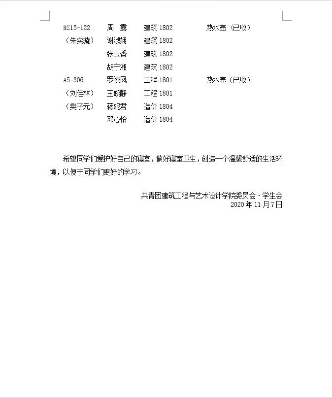 第九周突击检查寝室公示表