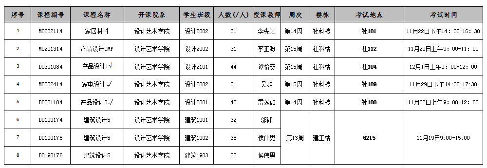 设计艺术学院 2022-2023-1学期 提前考试安排表