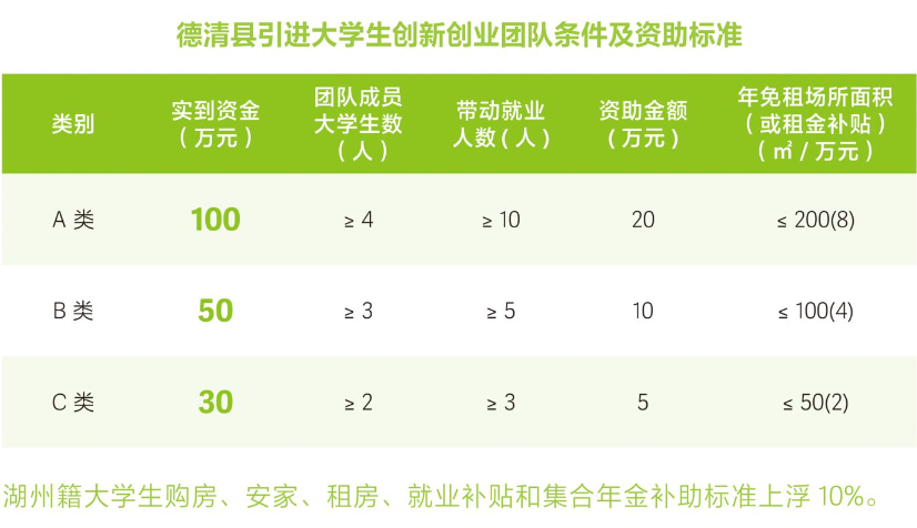 符合德清县产业发展导向、创新路径清晰、创业成果显著、预期效益明显的大学生创业企业,给予300万元创业担保贷款并贴息,可免费参加政府组织的中高端创业培训,项目就业大学生享受购房、租房、安家、就业等补贴。