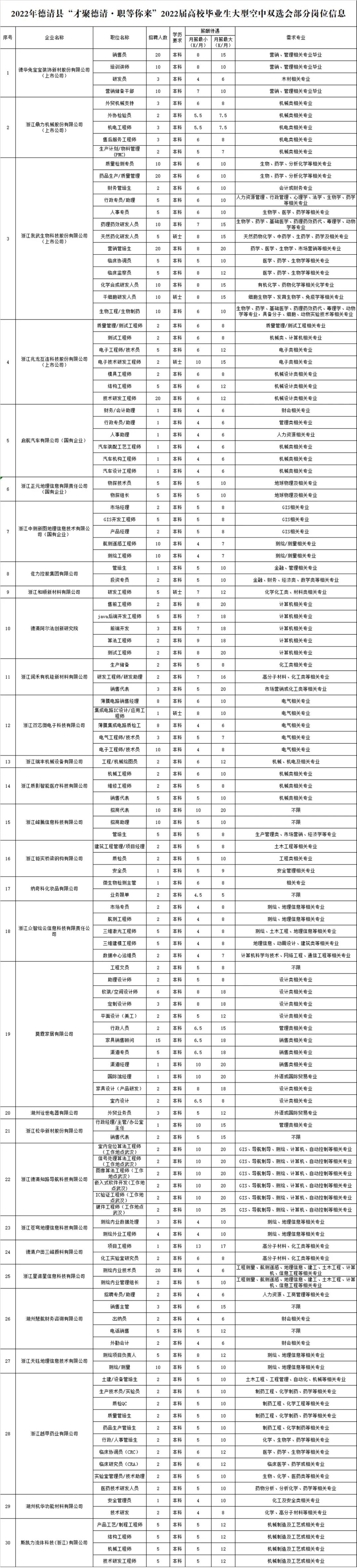 为贯彻“省市人才工作会议”精神,搭建平台,为用人单位招引更多适合岗位的优质人才,缓解疫情期间高校毕业生就业压力,进一步促进高校毕业生充分就业和实现更高质量就业,我县携手30余所合作高校,联合举办“才聚德清•职等你来”2022届高校毕业生大型空中双选会招聘活动。目前共有30家余家企业推出就业和实习职位1000个以上,诚邀各类人才前来应聘!
