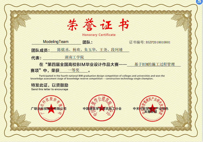 (1)“第四届全国高校BIM毕业设计大赛”基于BIM的三维建模和模拟动画(C模块),荣获全国一等奖。