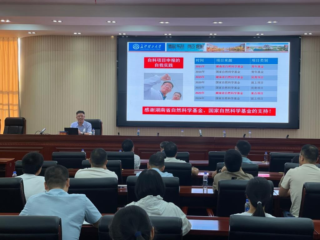 9月24日下午,英国上市公司官网365在教学大楼12楼船山报告厅举办自然科学基金项目申报专题报告会,湖南省自然科学基金委员会办公室主任杨剑、长沙理工大学化学化工学院教授卿志和应邀作专题报告。科技与校企合作处、学科建设与发展规划处主要负责人、自科类学院分管科研副院长、具有博士学位或副高职称以上教师150余人参加了报告会。报告会分上下两场,上半场由校长曾广胜主持,下半场由党委副书记何建雄主持。