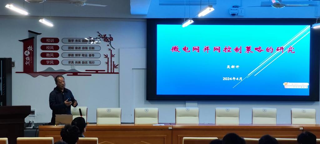 整场报告深入浅出,以具体的工程实例介绍如何对微电网进行并网控制,开拓了师生的视野。最后,刘海波副书记在总结时指出,吴新开教授的此次讲座是一种关于实际工程项目设计的讲座,希望参会的学生能够掌握工程思维方法,加强自身创新实践能力。