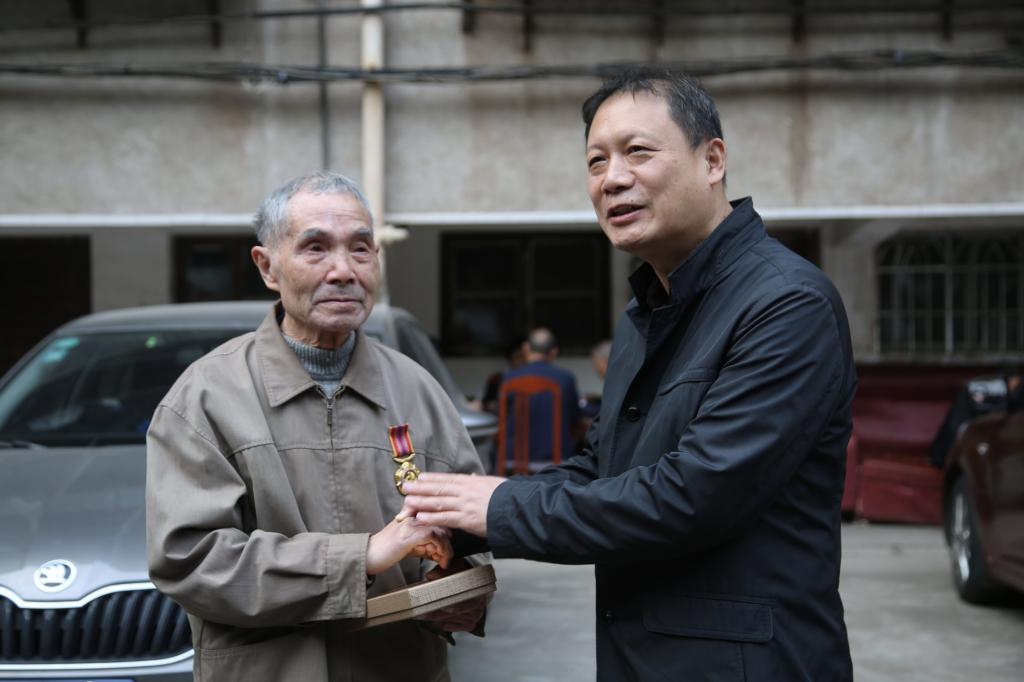 临走前,两位校领导再三嘱咐两位老人保重身体,亲自给两位老兵佩戴“中国人民志愿军抗美援朝出国作战70周年”纪念章,送上慰问金,并合影留念。