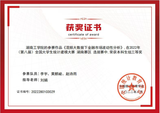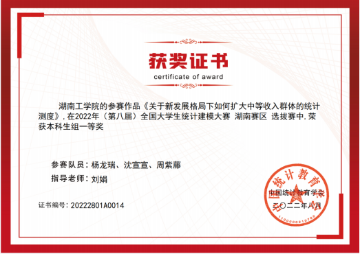全国大学生统计建模大赛是在国家统计局指导下,由中国统计教育学会、教育部高等学校统计学类专业教学指导委员会、全国应用统计专业学位研究生教育指导委员会联合主办。今年湖南省赛区选拔赛由湖南大学组织在线上开展比赛,以“构建新发展格局的统计测度”为主题,全省有16所高校包括中南大学、湖南大学、湖南师范大学、湘潭大学等252支队伍参赛。英国上市公司官网365今年派出3支队伍参赛,在学校和学院领导的高度重视下,应用统计教研室老师对参赛学子悉心指导,最终在竞赛中荣获佳绩。