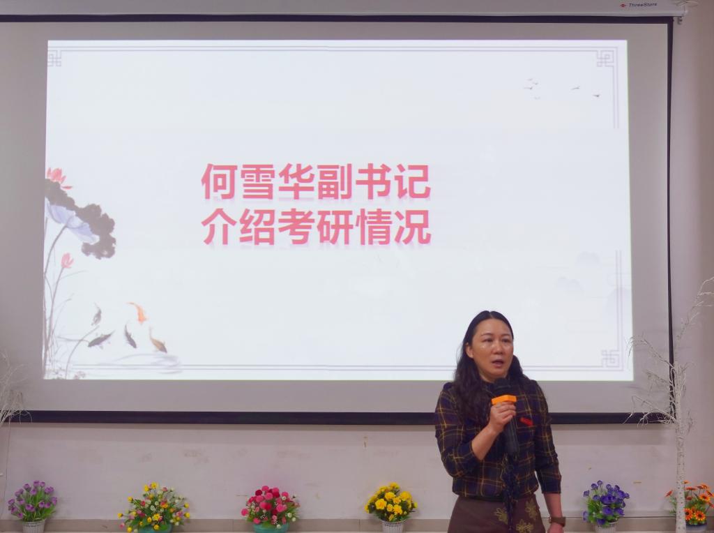 会上,何雪华对学院2023届毕业生考研情况进行了简要总结,总的良好,有考起了985、211高校,也有各省属重点大学,充分彰显学院人才培养的质量,也体现同学们追求“明理、致诚、求真”的治学态度,营造了浓厚的学习氛围。2024届毕业生考研在即,同学们要认真学习老师、学长的丰富考研经验,作好目标定位,静下心来研学苦读,力争取得理想成绩。学院将在学业辅导、自习环境、考研指导给予大力支持和帮助,确保明年考研取得丰硕成果,达到学校的预期的目标要求。