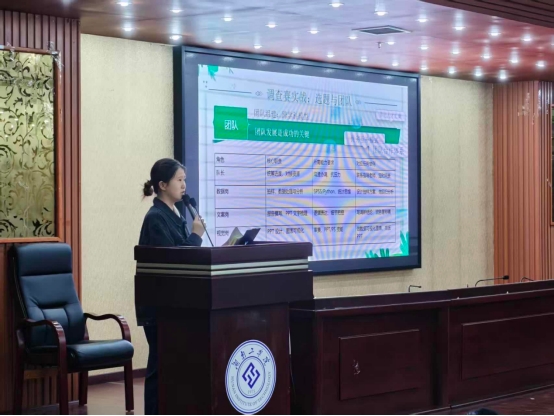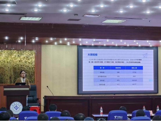 随后,指导教师刘娟从赛事流程、赛制规则到备赛要点进行了系统讲解。她以校赛、省赛、国赛三级晋级体系为主线,详细介绍了报名、调研设计、数据收集与分析、报告撰写及答辩展示等关键环节,帮助同学们全面把握赛事节奏与要求。