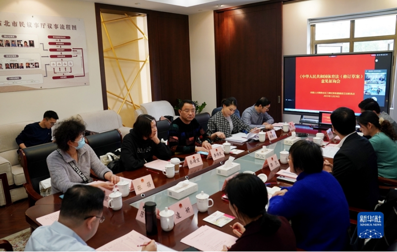上海长宁区虹桥街道基层立法联系点召开《中华人民共和国体育法(修订草案)》意见征询座谈会(2021年11月26日摄)。新华社记者 刘颖 摄