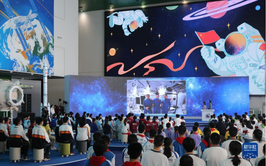 2021年12月9日,“天宫课堂”第一课开课,神舟十三号乘组航天员翟志刚、王亚平、叶光富在空间站进行太空授课。这是学生们在北京中国科技馆听课。新华社记者 金立旺 摄