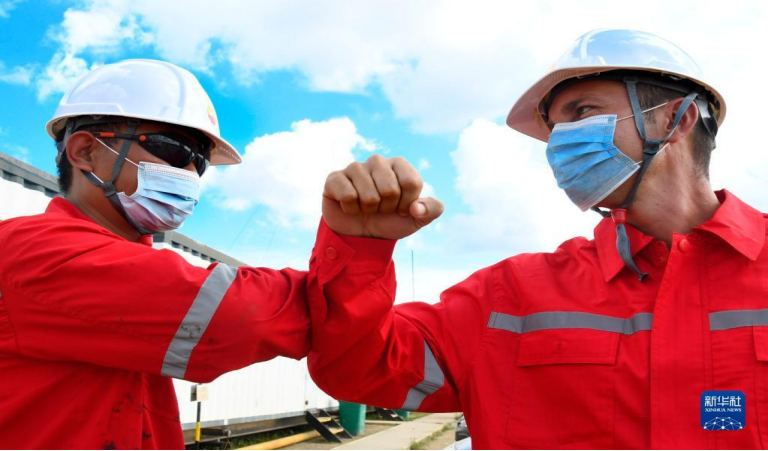 2020年11月27日,中国石油集团长城钻探工程公司古巴项目GW91钻井平台中方员工(左)同古方员工互相致意。新华社发(华金·埃尔南德斯摄)
