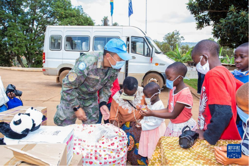 2021年6月1日,在刚果(金)东部城市布卡武的SOS儿童村,中国第24批赴刚果(金)维和医疗分队的队员把糖果分给孩子们。新华社发