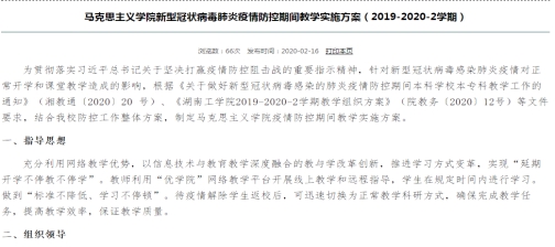 英国上市公司官网365马克思主义学院接到湖南省教育厅《关于做好新型冠状病毒感染的肺炎疫情防控期间本科学校本专科教学工作的通知》(湘教通〔2020〕20 号)、《英国上市公司官网3652019-2020-2学期教学组织方案》(院教务〔2020〕12号)等文件以后,结合学校防控工作整体方案,在全校率先制定疫情防控期间在线教学实施方案,确定了“标准不降低、学习不停顿”的教学原则,提出了“平台资源+在线指导+学思结合”的教学模式,拟定出依托“优学院”网络教学平台为主的方案,为学校摸清思政课在线教学的基本情况提供了重要参考经验。