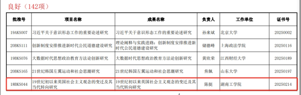 日,全国哲学社会科学工作办公室公布了《20251月国家社科基金年度项目结项情况》,我院陈挺博士主持完成的国家社科基金项目19世纪初以来英国社会主义观念的变迁及其当代转向研究”,经责任单位审核、省级主管单位受理、同行专家鉴定全国社科工作办审批,最终由全国社科工作办一次验收通过,并以扎实的研究成果从全国460个结项项目(338个项目予以结项、121个项目暂缓结项1个项目被终止)中脱颖而出,喜获“良好”等级(结项证书号:20250214),这我院加强有组织科研、深化科研项目管理的重要成效