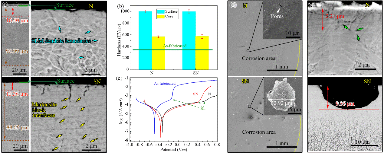马氏体时效钢广泛用于制造精密模具和航空航天零部件,其在湿热环境和沿海环境的应用需要同时提高强度和耐腐蚀性能。目前增材制造马氏体时效钢的常用后处理方法是时效析出,该方法在提高强度的同时会引发耐腐蚀性能退化的风险。这一矛盾使得增材制造马氏体时效钢在实际应用中需要寻求新的后处理方法。离子氮化作为传统钢件最常用的热表处理技术,有望同时提高增材制造马氏体时效钢的表层强度和耐腐蚀性能。然而增材制造钢件在氮化后会形成包含增材制造特征胞状亚晶结构的异质氮化结构,有别于传统制造钢件氮化后获得的均质氮化结构。由于腐蚀行为对工件组织结构特别敏感,增材制造特征胞状亚晶结构必然会对氮化结构的腐蚀行为产生新的影响,这是增材制造钢件在应用推广中遇到的新的科学问题。