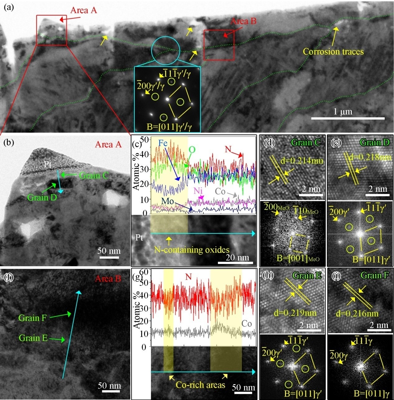研究结果表明:异质氮化结构和均质氮化结构均由最外层白亮子层和内部黑色子层组成,均可以同时提高增材制造马氏体时效钢件的强度和耐腐蚀性能。异质氮化结构中,增材特征胞状亚晶界面上会形成富氮的γ′相和相关的贫氮γ相。金属性的贫氮γ相增加工件中的活性点数量,并使腐蚀痕迹沿增材特征胞状亚晶界面发展。而陶瓷性的富氮γ′相能够连接在一起形成保护网,阻止腐蚀痕迹向内扩展。作为对比,均质氮化结构中,腐蚀痕迹沿马氏体板块(martensite block)界面向黑色子层扩展,导致深度达9.35微米的腐蚀坑。TEM表征证实两种氮化结构的腐蚀反应均为γ′/γ + O → MeO(N) + Me+(Me = Fe, Co, Ni, Mo).其中MeO(N)为FeO构型的氮氧化物,氧化越严重的位置,合金元素中Mo/Fe含量比越高。该工作可以为推进增材制造钢件在腐蚀环境的规模化应用提供灵感。