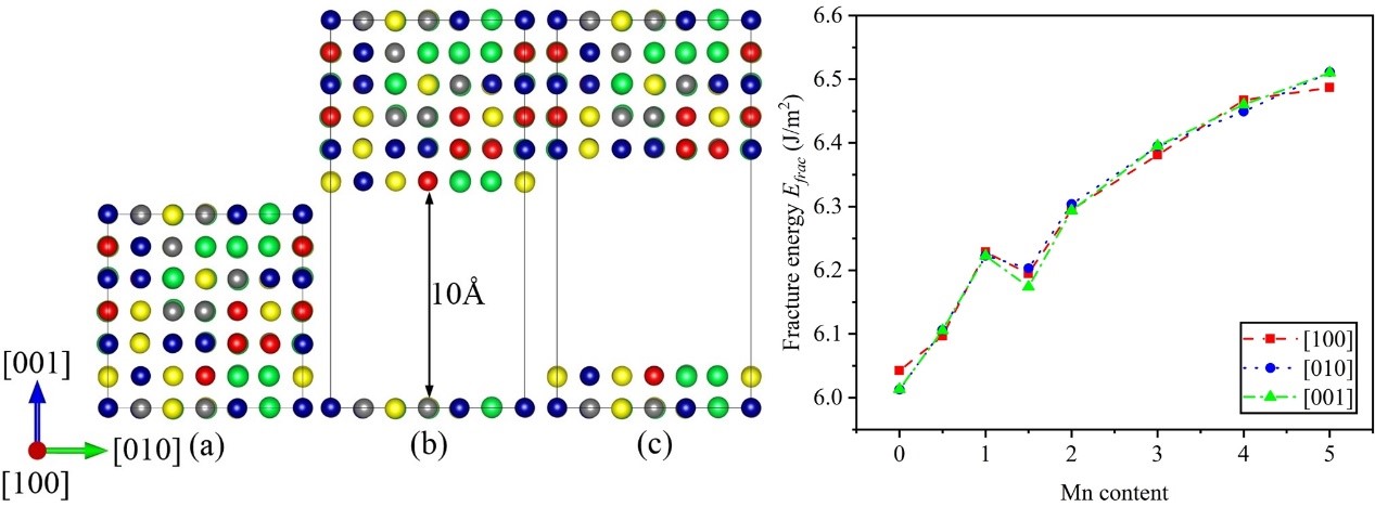图1 CrFeCoNiMnx(0≤x≤3)高熵合金的晶胞断裂面示意图和断裂能随Mn含量的变化曲线