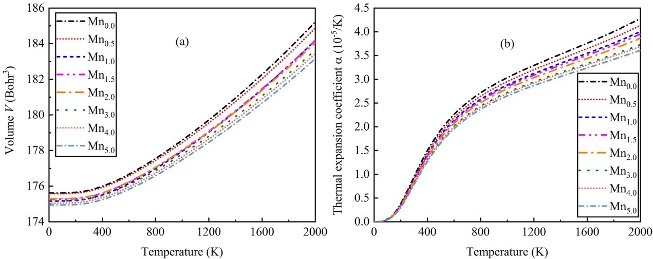 研究结果表明,CrFeCoNiMnx (0≤x≤3)高熵合金由于负的形成能而具有较好的热力学稳定性,同时较低Mn含量的合金体系具有更高的振动熵,使得高熵合金的晶体结构更加稳定。定容比热CV和定压比热CP在低温时表现的更加敏感,而在0-2000K范围内,高熵合金中Mn含量变化对CV值几乎不产生影响。较低Mn含量的高熵合金在加热时具有更大的热膨胀体积和热膨胀系数,表明随着Mn含量的增加高熵合金更难发生热膨胀。与此同时,研究发现CrFeCoNiMnx (0≤x≤3)高熵合金超晶胞模型在[100]、[010]和[001]三个晶体学方向上所需的断裂能随着Mn含量的增加而增大,表明增加高熵合金中的Mn含量将提高合金的原子键合强度,有助于提升CrFeCoNiMnx (0≤x≤3)高熵合金的抗断裂能力。该项研究工作为探寻高温条件下具有优异断裂性能的新型合金材料具有一定的研究价值。