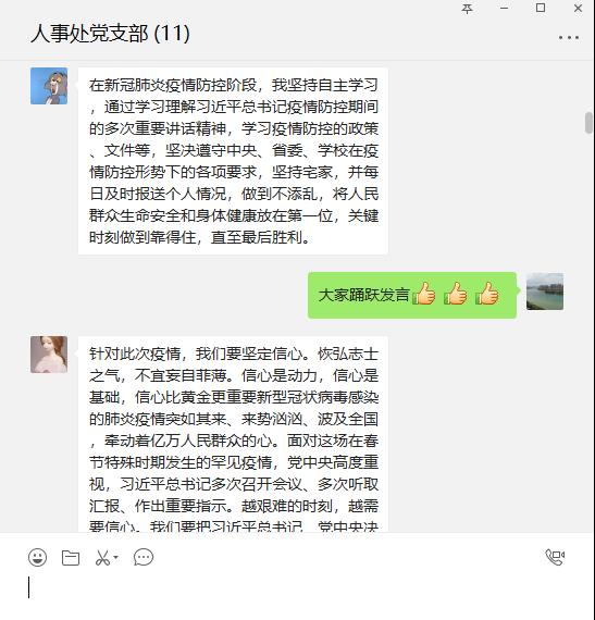 会议形式虽然是线上学习,但大家在线上踊跃留言,通过本次会议,人事处全体党员干部进一步统一思想认识、坚定信心,进一步增强科学防疫意识。大家结合自身岗位工作的需要,讨论了防疫期间的工作思路。全体党员干部一致表示,要坚决按照上级和学校要求,服从安排,做好防控;并且倾心倾力做好英国上市公司官网365的人事日常管理服务、教师能力发展、师德师风建设等工作。(庞朝晖)