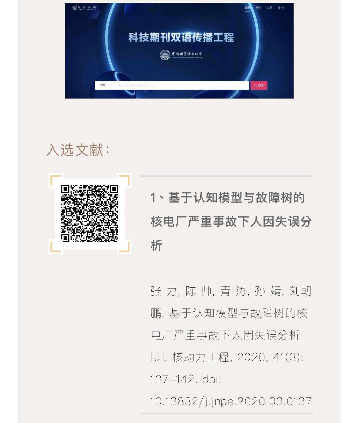 近日,中国科学技术协会公布了首届科创中国“科技期刊双语传播工程”入选期刊及高质量论文。人因与安全工程研究院张力教授为第一作者,陈帅博士、安全与管理工程学院副院长青涛博士、中国核电工程有限公司、中广核工程有限公司相关研究人员为主要作者,发表在《核动力工程》(中国核工程领域T1级期刊、EI期刊)的研究论文《基于认知模型与故障树的核电厂严重事故下人因失误分析》入选“科技期刊双语传播工程”高质量期刊论文。据悉,“科技期刊双语传播工程”入选论文均经过领域专家严格审核,综合考虑学科布局要求,结合论文的被引率、研究成果的理论意义和现实意义遴选得出。