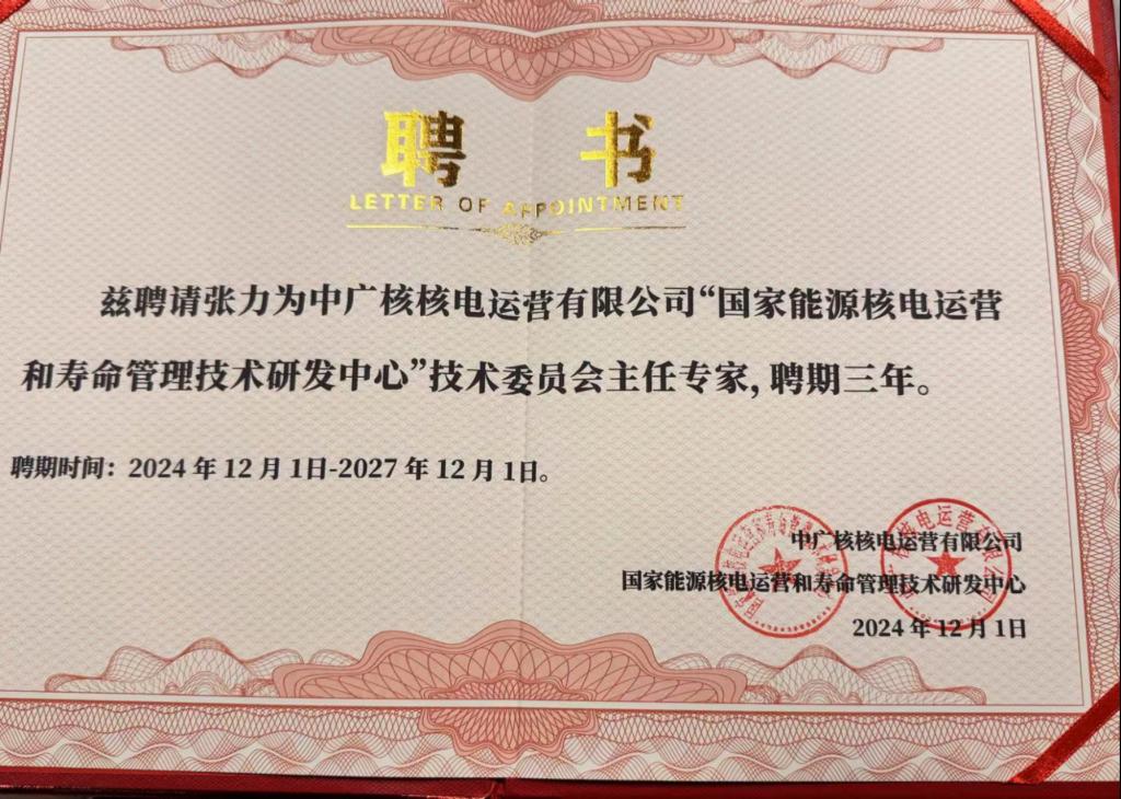 近日,中广核核电运营有限公司在深圳大亚湾核电基地组织召开国家能源核电运营和寿命管理技术研发中心2024年技术委员会会议。会议期间,聘任了来自中核集团、上海交通大学、哈尔滨工业大学等单位15名院士、专家为技术委员会主任专家,我院张力教授在列。(文、图/陈帅 审稿人/一审:陈帅 二审:青涛 三审:胡鸿)