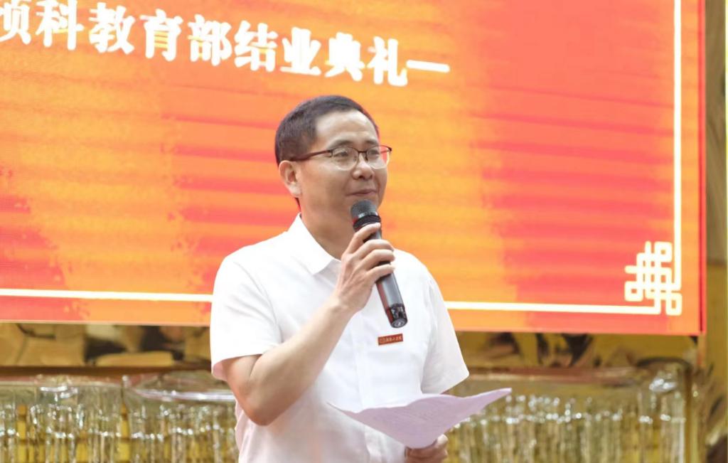 预科部主任贺新华饱含深情发表了讲话,他向348名同学顺利结业表示热烈祝贺,并如数家珍回顾了过去一年预科发展和学子成长的点点滴滴,记忆中令人尊敬和遗憾的人和事,引发现场强烈共鸣。接着,他给未来的同学们提出三点期盼:一是改变,面对变化时代,改变是最好的应对,要始终保持积极的心态,坚定信心、坚守信念,以更加热情、饱满的状态面向未来。二是自律,自律的最高形态是自由,真正的自由,是自律给你的选择权,自律意味着放弃眼前的舒适,为了远处的目标而努力,愿同学们以自律为帆、坚持为桨,直达理想彼岸。三是专注,找到自己感兴趣的领域,深耕细作,竭尽全力,最大限度发挥积极性、主动性和创造性,努力实现自己的目标,在面对多样选择时,要听众你心、行你所行,不计得失,无问西东。最后,贺主任勉励同学们在前行路上,心有阳光、无惧风雨,在青春的赛道上跑出强国复兴好成绩、书写勇毅前行的人生答卷。