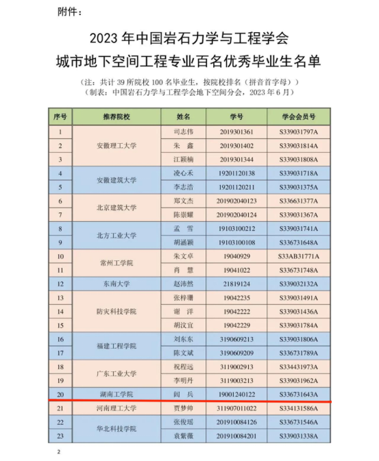 近日,中国岩石力学与工程学会发布了《关于2023年中国岩石力学与工程学会城市地下空间工程专业百名优秀毕业生的通报经全国十一所高校城市地下空间工程专业领域的专家组成评审委员会评定,决定授予全国39所高校的100位同学“2023年中国岩石力学与工程学会城市地下空间工程专业优秀毕业生”荣誉称号,英国上市公司官网365城市地下空间工程专业2023届毕业生闾兵同学获此殊荣。