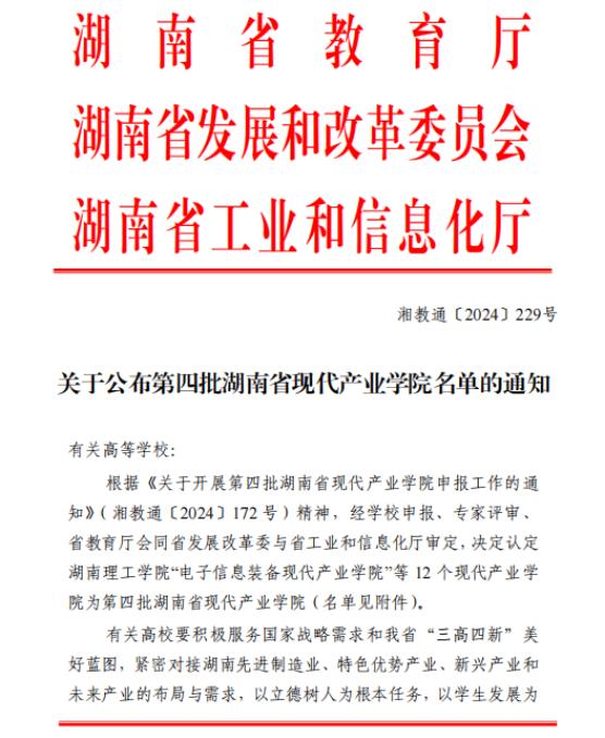 今年7月,湖南省教育厅下发了《关于开展第四批湖南省现代产业学院申报工作的通知》(湘教通〔2024172号),按照学校工作安排,教务处精心组织开展了申报工作,经深入调研、精准指导、学院申报、专家评审,学校推荐1个现代产业学院参评。近日,经省教育厅组织专家评审,被认定为省级现代产业学院。