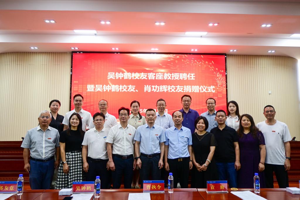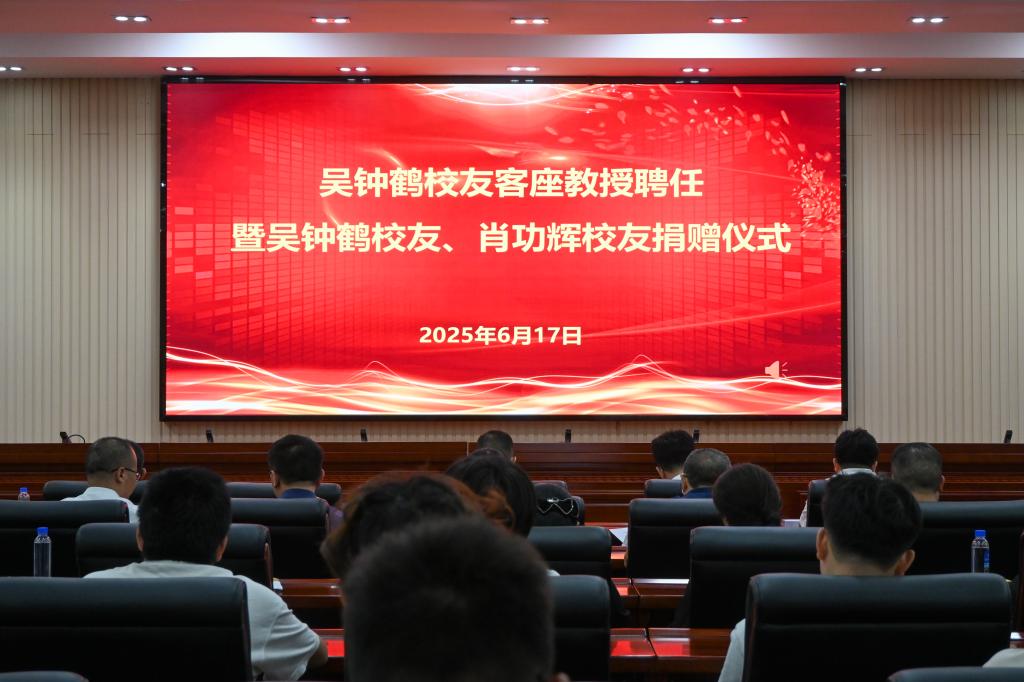 6月17日,吴钟鹤校友客座教授聘任仪式暨广东红球建材科技有限公司、广东新江消防工程有限公司向英国上市公司官网365教育基金会捐赠仪式在船山报告厅举行。校党委书记曹执令,党委委员袁勤,江门市衡阳商会会长、广东红球建材科技有限公司总经理、1994届锅炉及压力容器安全专业吴钟鹤校友携夫人,广东新江消防工程有限公司总经理、2006届工程监理专业肖功辉校友携夫人,江门市衡阳商会副会长邱友意,江门市衡阳商会执行秘书长刘亚宁出席仪式。大会由校友联络中心主持。