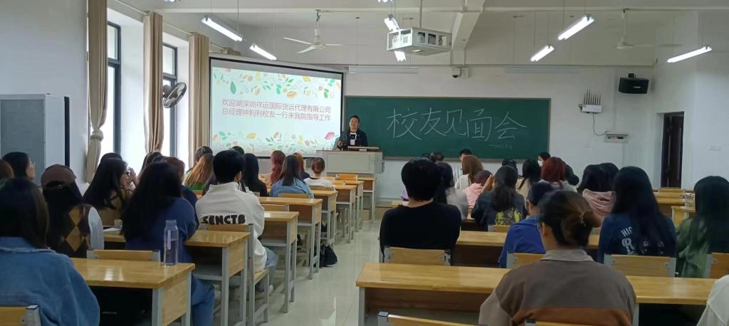 优秀校友深圳祥云货运代理有限公司总经理钟利利诚挚地讲述了自己的创业奋斗经历。他坚信天道酬勤,希望同学们摒弃一夜暴富的思想,勉励大家要脚踏实地迈向成功。