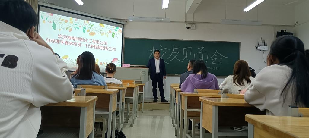 优秀校友湖南同聚化工有限公司总经理李春林讲述了自己辞去公务员“铁饭碗”下海创业的艰辛历程。他希望同学们努力提升专业素养,锤炼意志品质,增强自身综合素质,为实现理想奠定坚实基础。