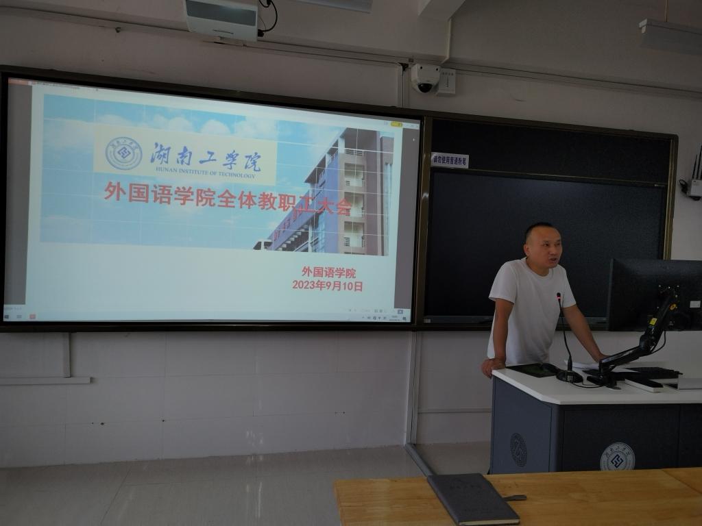 9月10日下午,外国语学院在外语楼202室召开新学期全院教职工大会。外国语学院全体院领导及教职工参会。会议由党委书记刘斌主持。