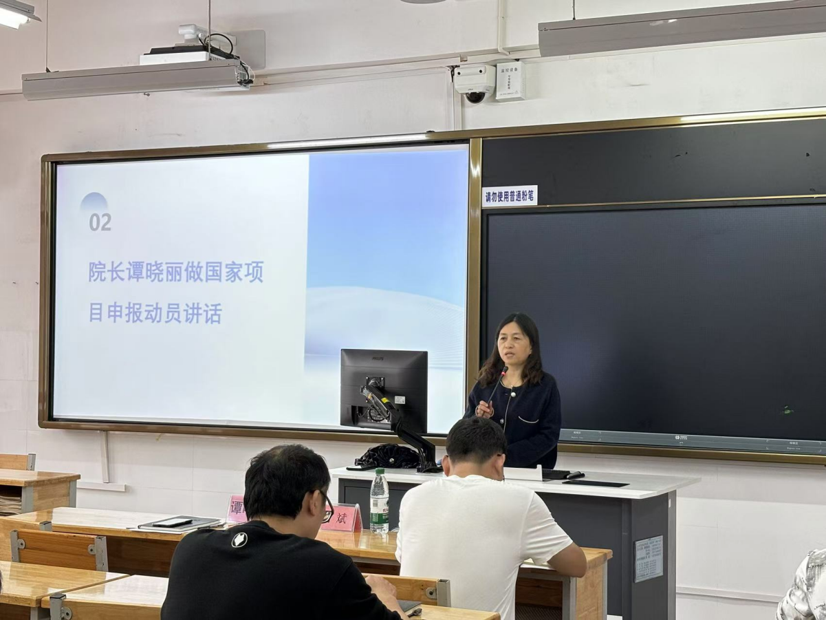 院长谭晓丽作了国家项目申报动员讲话。她指出,国家项目是提升学院科研实力、扩大学院影响力的重要途径,全体教职工要高度重视,积极参与针对已申报国家项目的老师,要组织团队进行打磨研讨,每两周进行一次,以确保申报材料的质量。此外学院还计划在下周举办一次申报辅导讲座,邀请专家为教师们提供具体的指导和帮助,切实提高教师的课题申报水平。