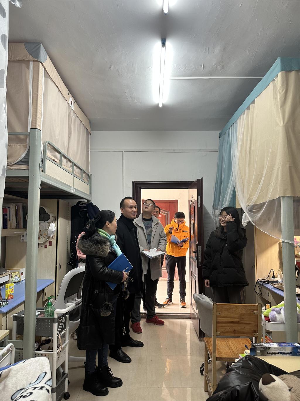 走访过程中,学院领导和老师向同学们致以新年祝福,与大家进行亲切交流,关切询问他们的假期生活、学习情况。借此机会刘斌嘱咐同学们做到:严格遵守宿舍安全管理规定,保持宿舍环境干净整洁,营造良好的学习生活氛围;及时调整心态,归心学习,充分应对期末考试;提高思想认识,将小我融入大湖工,以积极饱满的精神面貌迎接评估。