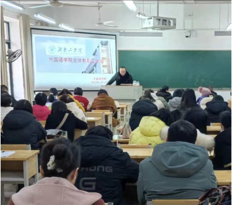 2月14日下午,外国语学院召开2022-2023-2学期期初教职工大会暨2023年师德师风专题培训会。全体院领导及全院教职工参会。会议由学工办主任张伟平主持。