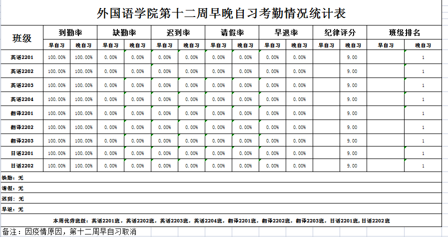 外国语学院第十二周早晚自习考勤情况统计表