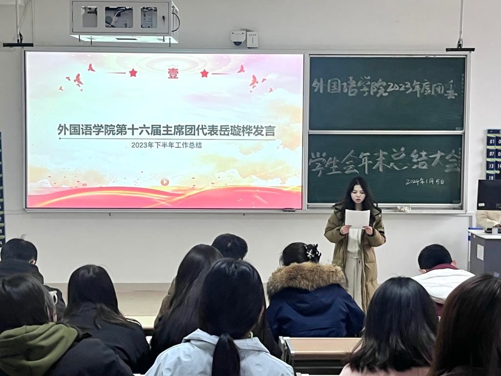 蒋蔚就2023年各项工作进行总结反思,并就2024年团学工作做相关探索策划,力争在新学期中继续凝练专业活动特色,打造外语品牌项目,为丰富校园文化生活添砖加瓦。