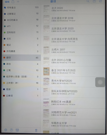 后面还买了一本韩刚老师的B2A来练习,这本书就是将翻译文本类型划分,因为时间原因,我后面挑了几个上外贸偏向于会出题的类型练的。平常翻译会准备一个活页笔记本/ipad的Notability如图