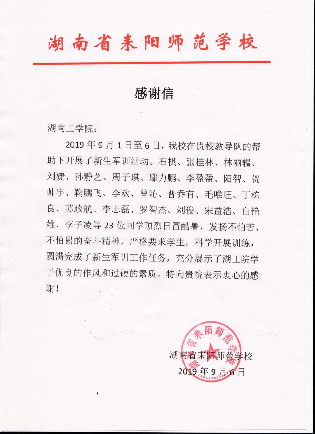 根据衡阳警备市教育局、衡阳警备区战备建设局统一安排,英国上市公司官网365教导队石棋等一行23人于9月1日至6日赴耒阳师范学校,对该校1000余名新生军训实施帮训,帮训效果良好,耒阳师范学校特发来感谢信,内容如下:
