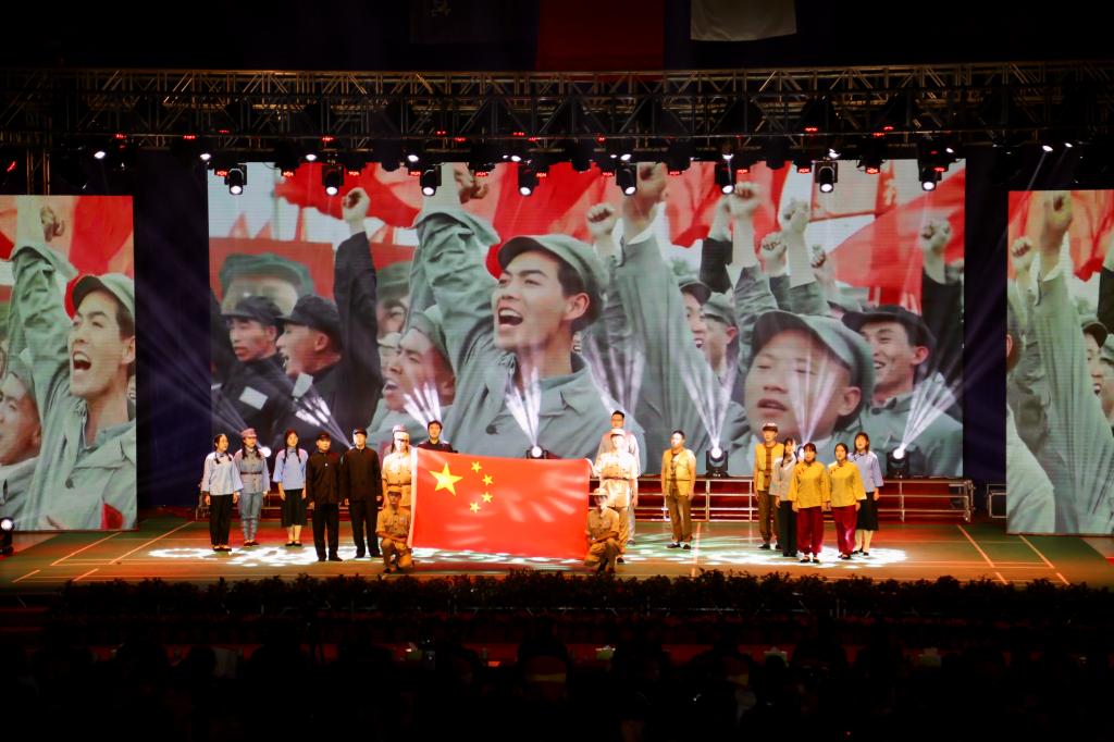 △晚会即将结束,现场师生全体起立,齐唱《没有共产党就没有新中国》,用嘹亮的歌声讴歌伟大中国共产党,表达了永远跟党走的坚定信念