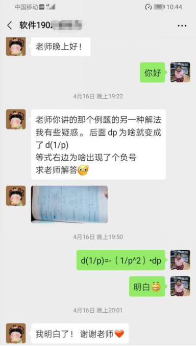 要学好数学,肯定离不开动手训练。每次课后,廖代喜老师都会在微信群发布事先准备好的作业题,要求学生做完作业后扫描,以班级为单位打包上交,并针对每章作业上一次习题课。他还时常利用微信与QQ解答学生在学习过程遇到的各种疑难问题。