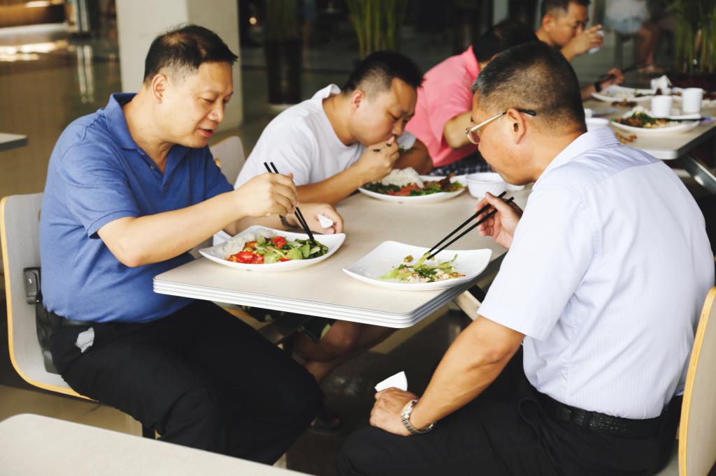 校长罗建华、副校长刘俊学与教职工们一道共享自助餐
