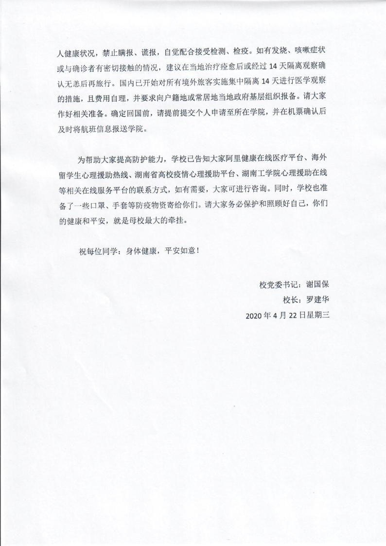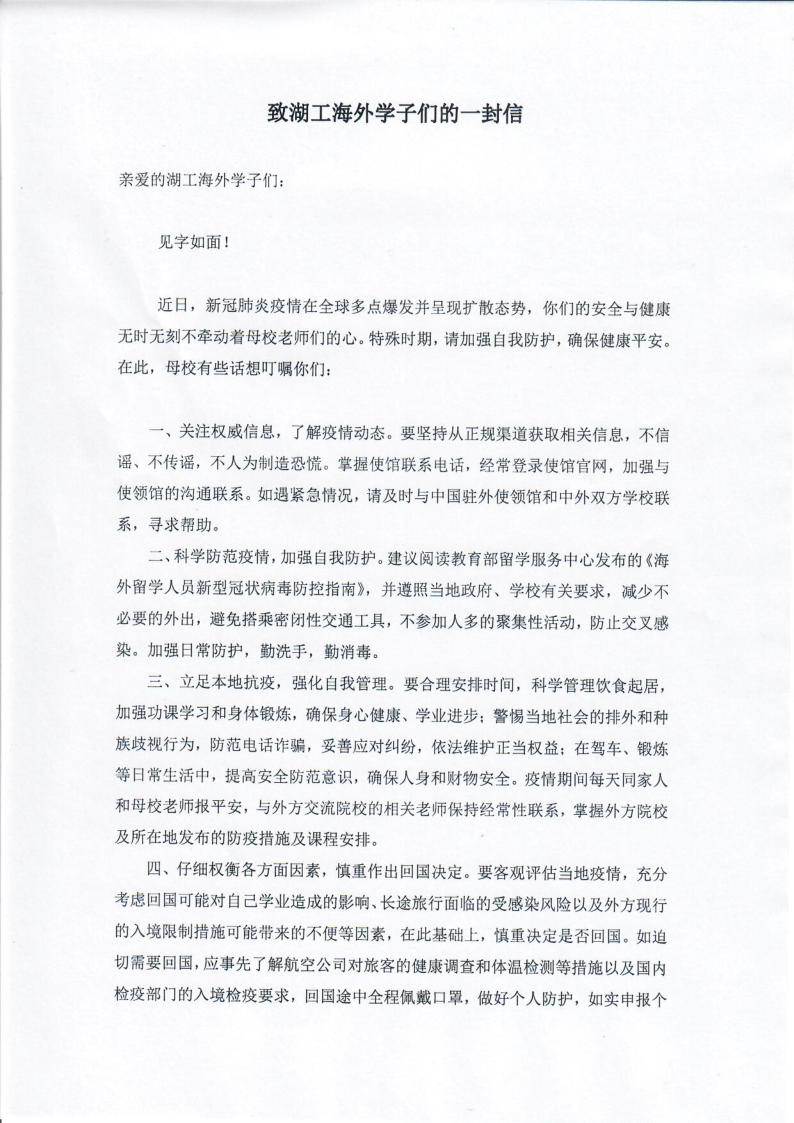 近日,9名在日留学生收到了学校为他们寄送的第一批口罩、手套等抗疫“爱心包”和“致湖工海外学子的一封信”。海外疫情爆发以来,学校时刻高度关注海外学子的安危,并将全体海外学子纳入学校整体防控工作的监控范围,要求相关部门做好他们的抗疫知识普及和心理辅导等工作,掌握他们在海外的学习和生活情况,了解他们遇到的困难,并尽全力进行帮助。国际合作交流处和相关二级学院成立了专门的工作小组,建立疫情防控台帐,指定专人与海外学子及他们的家长联系,并定期通过微信、QQ等方式宣传应对疫情措施和防控知识,提醒海外学子注意安全、科学防控