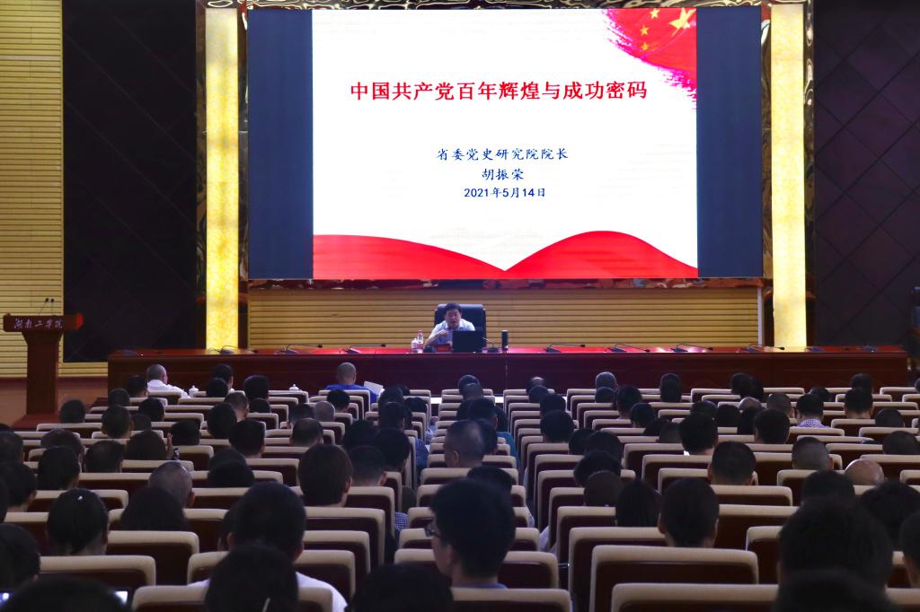 胡振荣教授以“中国共产党百年辉煌与成功密码”为题,用大量的党史数据、党史案例和生动的人物故事,从“中国共产党百年光辉历程--建党一百年怎么看、百年大党的经验启示--成功密码是什么、建党百年的湖南担当--湖湘共产党人奉献如何说”等三个方面阐述了中国共产党的百年辉煌与成功密码。通过本次学习,让广大学员对党的历史的理解和认识更加深刻,进一步认识到中国共产党为什么“能”,马克思主义为什么“行”,中国特色社会主义为什么“好”。