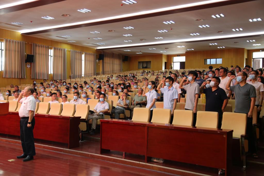 “我志愿成为一名人民教师,忠诚党的教育事业,遵守教育法律法规,履行教书育人职责……”刘升学带领新进教师进行了入职宣誓,新进教师们右手握拳高举,眼神坚定,铿锵誓言在会场回荡。