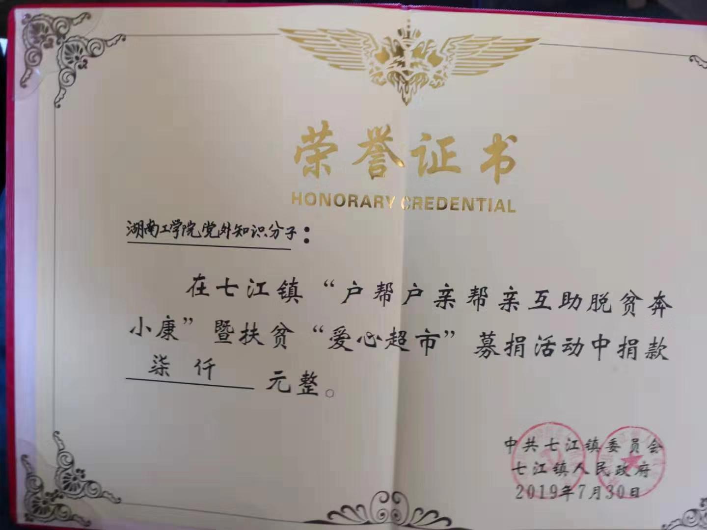 在捐赠仪式上,杨朗当场将全校广大党外知识分子募集的7000元善款交付给七江镇扶贫“爱心超市”负责人,七江镇党委书记罗立华向杨朗颁发捐赠证书,并代表七江镇党委、镇人民政府和七江镇广大父老乡亲向英国上市公司官网365广大党外知识分子表示衷心的感谢。