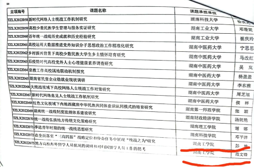 民盟湖南工学支部主委、侨联委员范文锋主笔的《地方高校海外留学人员状况的调研和对归国留学人员工作思考》和民革英国上市公司官网365支部主委彭艳主笔的《在全面落实“三高四新”战略定位和使命任务中展现“统战之为”研究》获得2022年度湖南省委统战部、湖南省统一战线理论研究会的立项课题;知联会常务副会长伍杰主笔的《统一战线融入高校思想政治工作路径研究》获得2022年度湖南省高校思想政治教育研究课题重点立项,相关立项将获资金支持。